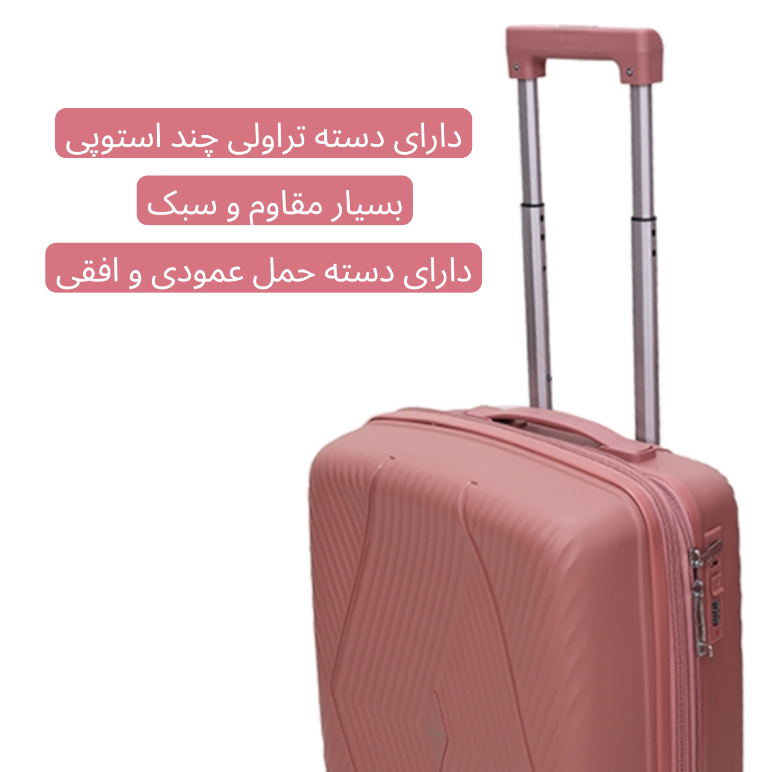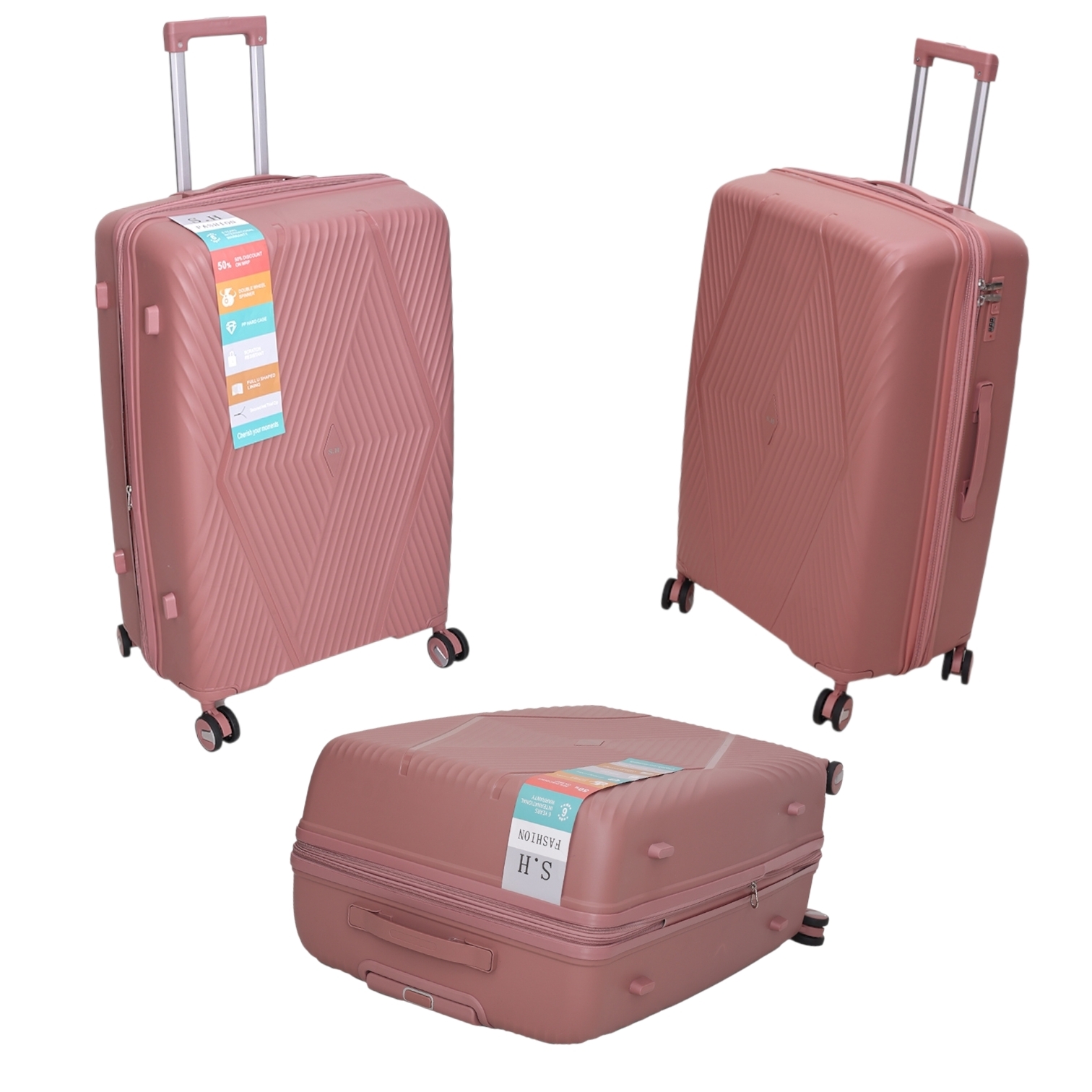 چمدان نشکن S.H SPECIAL SERIES یک مدل کاملا ویژه از سری برند فشیون هست که این برند هر چه داشته داخل این مدل گذاشته از ویژگی های این چمدان میتوان به بدنه پلیپروپیلن چند لایه کاملا نشکن،انعطاف پذیر بسیار مقاوم با طراحی بسیار چشم نواز و زیبا اشاره کرد همچنبن چرخ های دوبل ۳۶۰ درجه سایلنت نشکن و بسیار روان و بیصدا به همراه دسته تراولی چند استوپی آلومینیومی سبک و مقاوم آن به همراه دسته های حمل افقی و عمودی این چمدان حرکتی کاملا بی دغدغه و آسانی را در هر شرایط برای شما فراهم خواهند کرد. زیپ های دوبل ضد سرقت روان با همراه سرزیپ های استیل متالیک نشکن و از همه مهم تر قفل بینالمللی ضدسرقت TSA 007 یک پکیج امنیتی کامل را برای شما فراهم خواهند کرد.این چمدان با ابعاد بسیار مناسب و جادار خود خیاله شما را از بابت جا دادان وسایل داخلش راحت میکند با این حال هم این چمدان دارای یک زیپ افزایشی هست که میتواند حجم داخلی چمدان را تا ۲۰ درصد بیشتر کند تا وسایله بیشتری را داخل آن جا بدهید.داخل این چمدان هم دارای پارتیشن بندی کاربردی هست که علاوه بر آن یک فیکساتور لباس هم نیز داخل چمدان طراحی شده تا لباس های تان منظم سر جای خودشان بمانند. درکل چمدان نشکن S.H SPECIAL SERIES یک چمدان با طراحی زیبا و چشم نواز که میتواند تمامی آن چیز که شما از یک چمدان ایده ئال میخواهد را برآورده کند